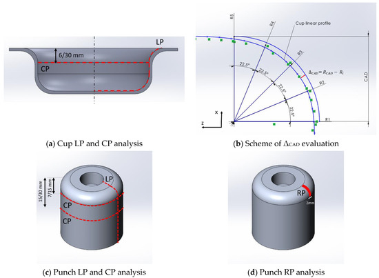 A linear profile (LP) analysis to identify the internal shapes of the cups (Figure 2a), to measure the effective drawing heights (hd), and to record the differences between actual values for cup fillet radii and those of ideal CAD geometry (ΔCAD). These latter two parameters were evaluated as an average of five measurements taken with a constant angle (22.5°) between two consecutive points (Figure 2b). The LP analysis of the punches was carried out to identify possible plastic deformations of the fillet radius due to the drawing process, and to evaluate the punch height (hp) after the cup’s production.