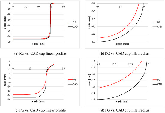 Comparing the above results, it is clear that RG is more accurate than PG. Figure 5a shows how the RG geometry profile fits that of CAD. Figure 5b shows the main difference between the two, with respect to the fillet radius, where a difference of 1.09 mm was recorded. However, considering the 10 mm value of the ideal fillet radius, this is equivalent to a percentage deviation of 89%. In terms of drawing depth, the results shown in Table 3 reveal that RG produced cups with a drawing depth which was 99% of the expected value. In the PG test, the percentage deviations from the ideal fillet radius of 6 mm, and from the expected drawing depth of 15 mm, were 75% and 92%, respectively. It can therefore be asserted that the linear profile obtained with RG is more accurate than that obtained with PG.