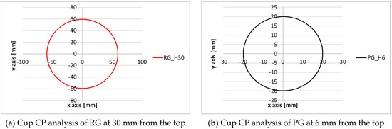 CP analysis confirmed the LP results. The cups were produced with an average radius Rmed that diverged from the punches’ radius by just hundreds of microns, and with near-negligible standard deviation, as Figure 6 illustrates visually, and Table 4 describes quantitatively. Table 4 also shows that absolute values of roundness tolerances were higher in RG but were lower in percentage terms when related to the Rmed (0.53%).