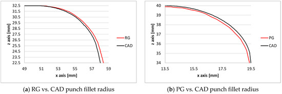 In this section, results of the measurements taken from punches after the deep drawing process are presented. The LP analysis shows how punches withstood the drawing process without significant permanent deformation; this is illustrated in Figure 7, in which the RG and PG punch fillet radii are compared with those of CAD. Table 5 presents the punch heights measured at the end of cup deformation. The analysis demonstrates that neither punch suffered permanent deformation.