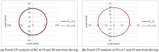 The CP analysis highlighted the behaviour of punches, as follows: the two circumferences obtained at different distances from the punch top (Figure 8) are perfectly overlapped for PG; in RG the circumference acquired at 15 mm (the black line in Figure 8a) is slightly inferior to the circumference acquired at 30 mm (the red dotted line). However, an analysis of the roundness tolerances shown in Table 6 and the rt percentage on radii revealed that all values of the latter were below 1.5%, with a minimum value of 0.4% in the case of RG_H30.