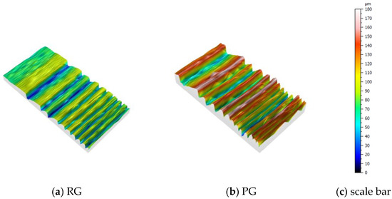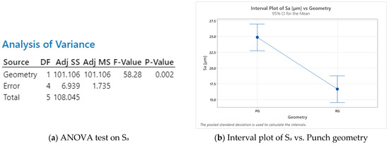 The results of the roughness profile (RP) analysis are presented in Figure 9 and Figure 10. A qualitative and comparative observation of Figure 9 shows that RG has a smoother morphology than PG. To confirm this finding, Figure 10a presents the results of an analysis of variance (ANOVA) test of the average surface roughness Sa. These results (p-value < 0.05) confirm that the choice of punch geometry is significant. In addition, the interval plot depicted in Figure 10b shows that the fillet radius of RG has a lower Sa value (16.6 µm).