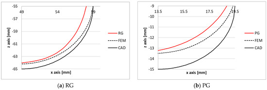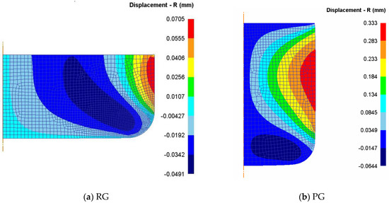 Finally, a comparison of the radial displacements undergone by the punches due to the compression loads is shown in Figure 13. Simulation results show a significant difference between RG and PG: the RG exhibited a displacement in a range of hundredths of a millimeters, with a maximum value equal to 0.07 mm; however, PG exhibited a maximum displacement of 0.33 mm.