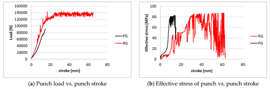 The FEM curves for the two punches lie between those of the CAD and experimental; this indicates a good ability to simulate the deep drawing process. After validation, simulations were used to highlight the behaviour of punches during the deep drawing process. Figure 12a plots the punch load as a function of the stroke. It can be seen that both RG and PG loads exhibit increasing trends with similar slopes. At a 15 mm stroke, PG attains a maximum load of 91 kN; however, RG values increase further until a maximum value of 136 kN is attained, which then remains constant. Contrarily, the plots of effective stress in Figure 12b show trends characterized by different slopes (higher in PG, lower in RG) in which both simulations nonetheless attain a similar maximum value of around 80 MPa. The noise phenomenon visible in the RG plot is due to a loss of contact between the cup and the selected node during the simulation process.
