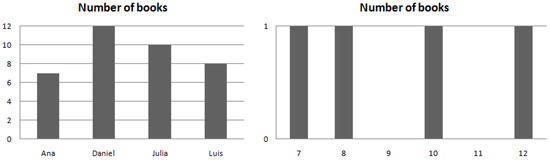 Another example where this type of confusion appears is in exercises like the one illustrated below: “Ana has 7 books, Daniel has 12, Julia 10, and Luis has 8. Represent these data in a bar chart”. In this case, when students are asked to represent the information by means of a bar graph, this means they should organise the information within a graph containing four bars—one for each individual—with heights varying according to the number of books possessed. However, in this case, a bar graph should have four bars, each representing one of the observed quantities, all with the same height; this is because the height is determined by its frequency, which in the case in question is unitary, for each student. Figure 1 shows what the expected solution looks like and what would actually be obtained according to the definition of a bar graph.