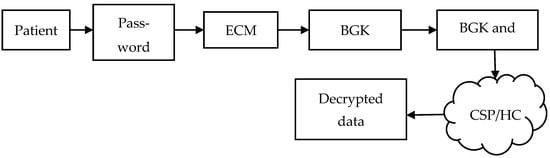The BGK and password are used to perform the decryption process, as shown in Figure 4. By performing this process, the ciphered document is accessed without a primary user and updates the information during its session period. This helps to save the patient’s life and keep track of their health conditions continuously.