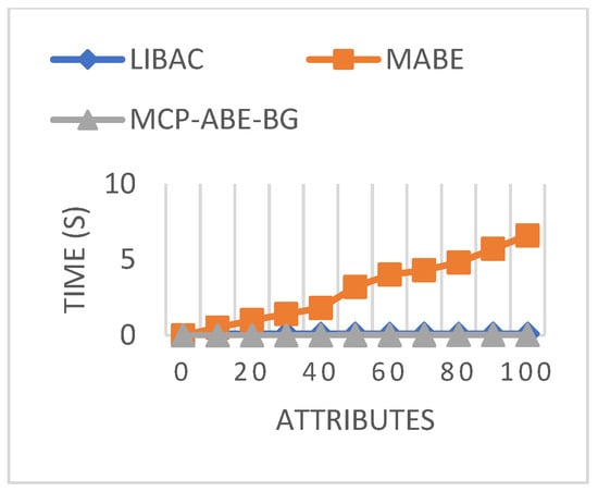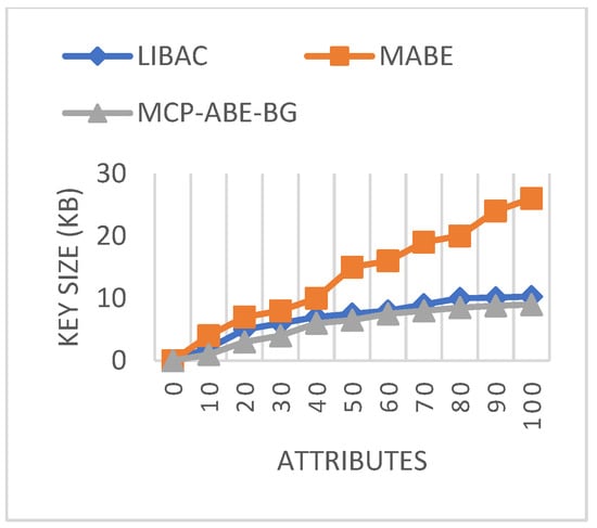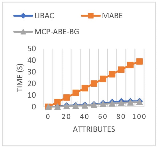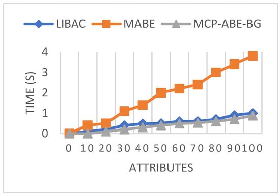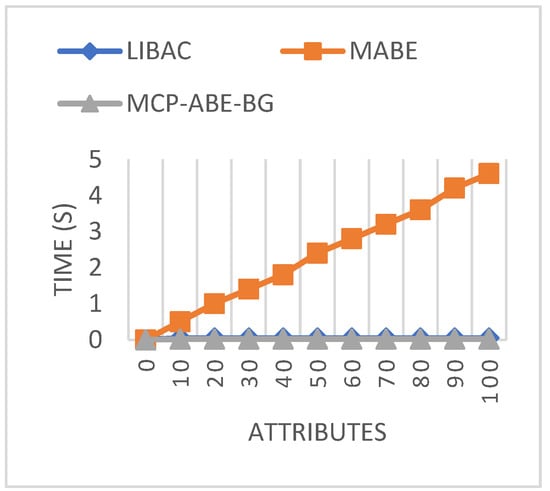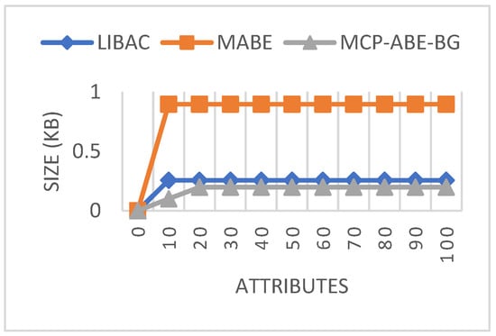 Figure 9 shows the comparison of public key sizes using different access mechanisms. In LIBAC and MCP-ABE-BG, the public key size maintains a constant value of 0.256 kB and 0.896 kB, respectively, for all attributes. However, in the proposed MCP-ABE-BG, the key size, at both lower and higher attributes, is only 0.198 kB, which is minimal compared to the other two approaches.