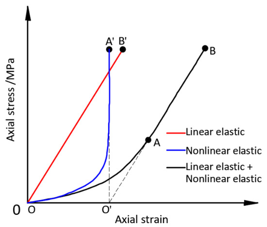 The typical stress‒strain curve of the rock specimen under uniaxial stress is shown in Figure 1, which can be divided into four stages: (1) the compression of pores and fractures (section OA); (2) elastic deformation and the stable development of microfractures (section AC), where point B is the elastic limit; (3) the unstable developmental stage of the fractures (section CD); and (4) the stage after rock rupture (after point D). As shown in Figure 1, the deformation rate slows down with increasing stress in the compression stage (section OA), which is because the elastic modulus increases with decreasing rock specimen length. In order to distinguish between the nonlinear elastic and linear elastic deformation of the rock in Figure 1, a straight line (OB’ parallel to AB) through the coordinate origin was drawn, and the difference between the curve OAB and the straight line OB’ was the curve OA’, as shown in Figure 2. The straight line OB’ and the curve OA’ represent the linear elastic and the nonlinear elastic deformation of the rock, respectively.