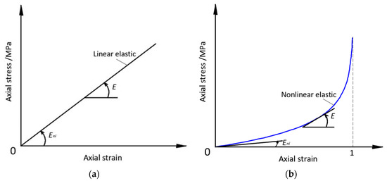 The elastic modulus of the linear elastic material remains unchanged during deformation, as shown in Figure 3a. The Eni parameter is introduced, which represents the initial elastic modulus of the material, and we have the following:
