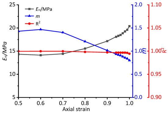 The initial compression stage of a rock specimen represented by the single stress‒strain curve was calculated using the method shown in Figure 1. For different ranges of stress‒strain curves with strain from 0 to 0.5, 0.6, 0.7, 0.8, 0.9 and 1.0, the unified nonlinear elastic model was used to fit them using the least square algorithm method. The values of Eni and m for the unified nonlinear elastic model are obtained, and the correlation coefficient R2 values were recorded. The horizontal axis in Figure 6 represents the different ranges of the stress‒strain curve, with the Eni, the m values and the R2 values located on different vertical axes. The red line represents the R2 values, and its fluctuation range is very small. All the R2 values are greater than 0.98, which showed a good relevant fit for the different ranges. The values of Eni decrease with a larger range, whereas the m value increases with it. These trends become obvious when the strain is greater than 0.7 and very obvious when it is greater than 0.95. There is a negative correlation between the Eni values and the m values.