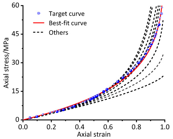 The different curves of the unified nonlinear elastic model with the Eni values and m values, which were both obtained after fitting different curve ranges, are listed in Figure 7. As the fitting curve range increases, the calculated curve gradually approaches the target curve. The red line was calculated using the parameters after fitting the curve from 0 to 1.0, and is the curve of best fit.