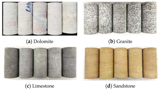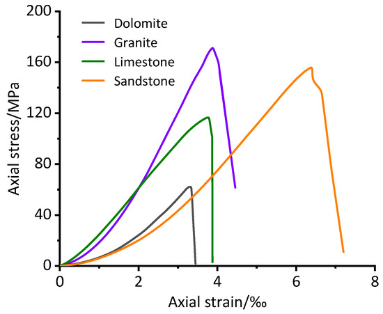 The fitting effect of the unified nonlinear elastic model and whether it could express the nonlinear elastic deformation of different rock types required verification by indoor experiments. Four different types of middle to hard rocks were selected for uniaxial compression testing with the rock mechanics test system. The four types of rock were dolomite, granite, limestone and sandstone. Cylindrical samples were prepared according to the suggested methods proposed by the International Society of Rock Mechanics and Rock Engineering (IRSM) [38]. The samples were 50 mm in diameter and 100 mm in length. The appearance of the samples was checked to ensure that they had no foliation, joints or big fractures and that, to some extent, they were intact rock specimens. The differences between the four rock types were directly attributed to the mineral components, porosity and microfractures. The samples of the four rock types have the same brittle failure characteristics.