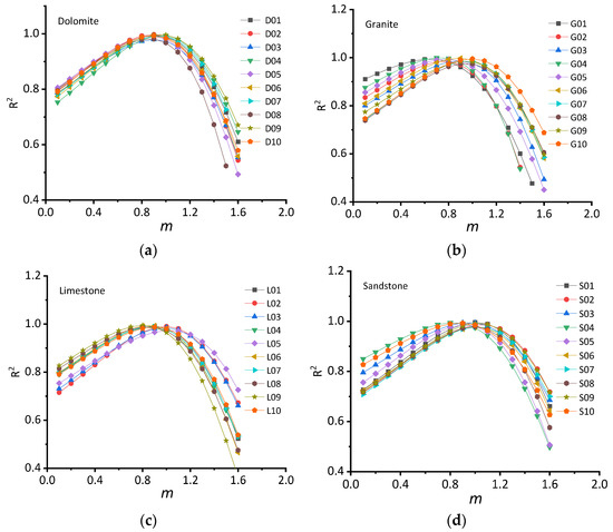 The R2 values with different m values for different rock types. (a—Dolomite; b—Granite; c—Limestone; d—Sandstone).