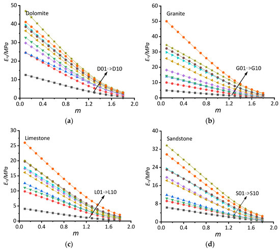The scatter plots of the Eni and m values are listed in Figure 12. All the curves in Figure 12a–d show a downwards trend, indicating that the Eni values are negatively correlated with the m values, which follows the same rule of fit for a single curve shown in Figure 6. The Eni values increase as the serial numbers of the different rocks increases, and the position of the curve is also higher. The linear relationship of all the curves was good when the m values were less than 1.2, and the curves gradually approach each other with decreasing rates when the m values were greater than 1.2, as shown in Figure 12a–d. The scatter points hardly overlap with one another, that is, the Eni values have good independence and non-repeatability. The Eni values depend on the basic properties of the rocks, such as the m values, and the basic attributes are natural. It is not feasible to obtain the Eni values of all rocks by using the same m value, which is why the unified nonlinear elastic model contains both Eni and m values.