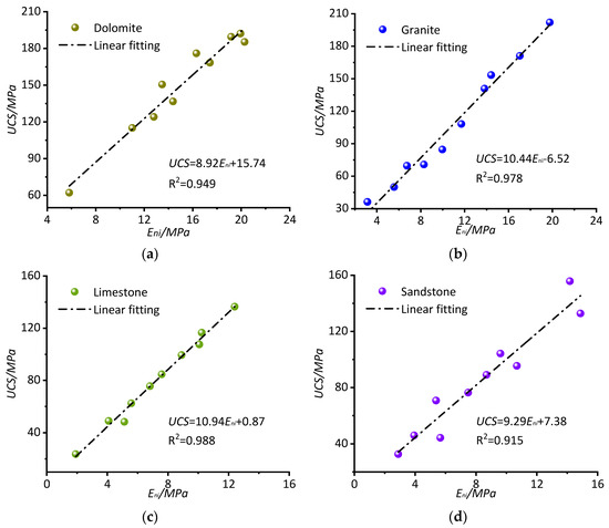 Correlations between UCS and Eni for different rock types. (a—Dolomite; b—Granite; c—Limestone; d—Sandstone).