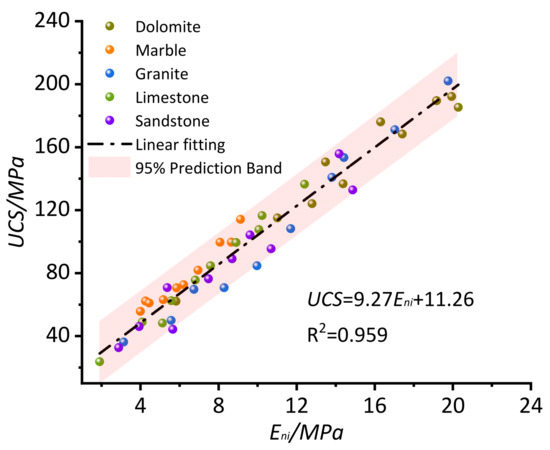 According to the data in Table 1, the uniaxial compressive strength (UCS) values and the initial elastic modulus Eni values for the different rocks were counted, and the scatter diagrams are shown in Figure 13a–d. The results of the linear fitting of the data are also shown in these diagrams. The coefficients of correlation R2 values for the four rock types are greater than 0.90, indicating that the UCS values and the Eni values have a good linear relationship [39]. The slope and intercept of different linear fittings and the R2 values are listed in Table 4. Granite and limestone have the highest R2 values, followed by dolomite and sandstone. The slopes of the linear formula for the different rocks were close, whereas the intercepts were different. When marble was added as another rock type, the scatter plots of the UCS and Eni values for the five rock types were determined and are listed in Figure 14. The results of the linear fitting of the data are also shown in Figure 14. In order to ascertain whether the experimental values were, in fact, unique to the present model, the 95% prediction band for the present model was determined and is represented by the red band. Almost all the experimental data fall within the 95% prediction band of the present model, which means that the UCS values can be predicted by the Eni values. The linear fitting formula is listed below: