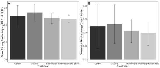 Gross primary productivity (A) and community respiration (B) of marine microbial biofilms exposed to either predation by the common periwinkle snail and/or 150 ppm rhamnolipid for 14 days. N = 8 ± SD.