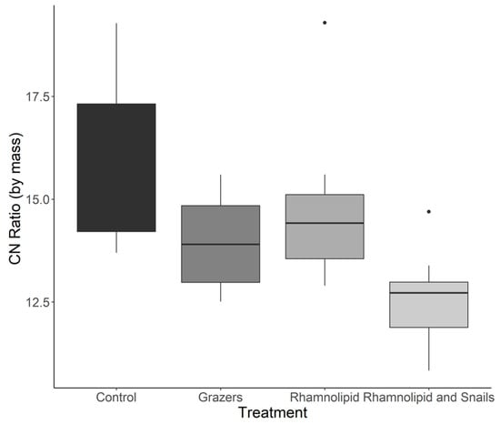 Carbon: nitrogen ratios of marine microbial biofilms (n = 8) exposed to predation by either the common periwinkle snail and/or 150 ppm rhamnolipid for 14 days. Dots indicate outliers in the data for figure visualization.