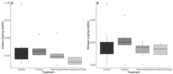 Carbon (A) and nitrogen (B) quantities within marine microbial biofilms (n = 8) exposed to either predation by the common periwinkle snail and/or 150 ppm rhamnolipid. Dots indicate outliers in the data for figure visualization. All mesocosms were treated similarly and were thus equally affected by the low-level deposition of inorganic solids from the sea water flowing through the system. This deposition decreased the relative carbon and nitrogen contents within the measured biofilm, which were analyzed after a 14-day exposure.