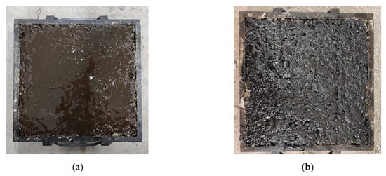 the appearance of permeable material (traditional, high-permeability emulsified asphalt and its modification). (a) Just after spraying the permeable material (b) After breaking of the permeable material.