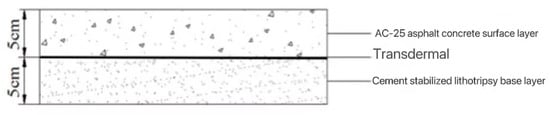 As the most common form of pavement structure for highways in China, semi-rigid base layers and asphalt concrete surface layers are widely used for their excellent road performance with high load-bearing capacity, good water stability, etc. [1]. China’s current specification regards the pavement structure as a multi-layer elastic system with complete continuous layers but the pavement surface is not a completely continuous bonding state because the construction on site is a layered operation with different materials between the base and surface layers and poor co-ordination of deformation [2]. Under the action of high pressure, it is easy to produce interlayer slip, rutting, surface cracking, and other distress [3]. Due to the difference in material properties between the surface course and the base course, the bonding performance of asphalt mixture and chemically stabilized materials is poor, which will cause distress such as a shear slip or reflection cracks of asphalt mixture on the surface course [4]. To improve the continuity between the asphalt pavement structural layers, the interlayer bonding layer is usually set. It can improve the bonding performance between the base and surface course and make the whole pavement structure more complete and more continuous. Spreading prime coat asphalt on the semi-rigid base can significantly improve the bonding ability between layers; it can effectively prevent the occurrence of pavement distress.
