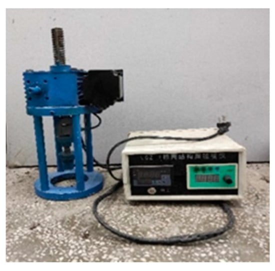 The bonding strength between high-permeability emulsified asphalt and stone slab was tested by using LGZ-1 surface structure layer puller shown in Figure 4, among which ordinary emulsified asphalt, high-permeability emulsified asphalt, and modified high-permeability emulsified asphalt were used as bonding materials. Spray the base plate with ordinary emulsified asphalt, high-permeability emulsified asphalt, and modified high-permeability emulsified asphalt according to the ratio of 0.7 L/m2, 0.9 L/m2, 1.1 L/m2, 1.3 L/m2, 1.5 L/m2, and move the base plate into the standard curing room for 7 days. Then, they were put into the test mold of 300 mm × 300 mm × 100 mm. After cooling for 12 h, the test mold was removed, and a φ10 drill bit was used to drill 5 cm from the top surface of the double-layer plate down to the interlayer bond interface (up to 4 drills per double-layer plate), and then the pull-off test was performed [27]. The test set is shown in Figure 5.