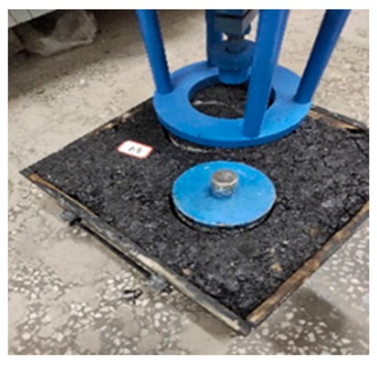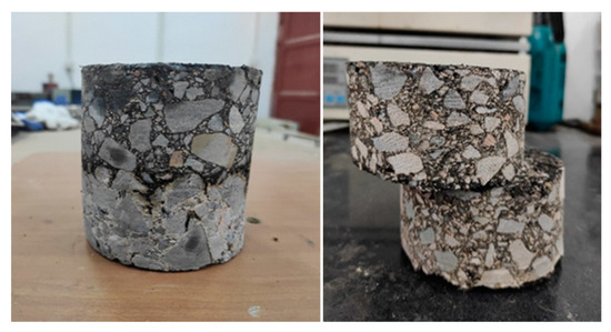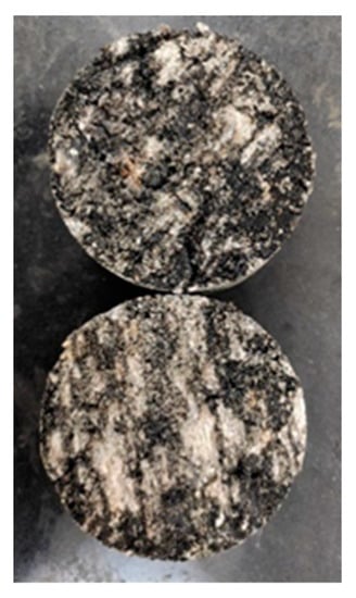According to the test method in the specification [26], the curing life of the cement-stabilized macadam base is taken as the test variable to measure the influence of permeable materials on the penetration depth of the base plate at different times. After the cement-stabilized macadam base plate formed, the plates were placed in the standard curing room for 0 h (i.e., spraying immediately after formation), 10 h, 3 d, 7 d, and 28 d. After reaching the curing age, 1.5 L/m2 ordinary emulsified asphalt, high-permeability emulsified asphalt, and (modified) high-permeability emulsified asphalt were sprayed. After emulsified asphalt is completely broken, a core sample of φ10 × 10 cm was drilled by a core drill machine, and the penetration depth of the core sample was measured. Figure 2 below is the appearance of the specimen after spraying the high-permeability emulsified asphalt (or its modification).