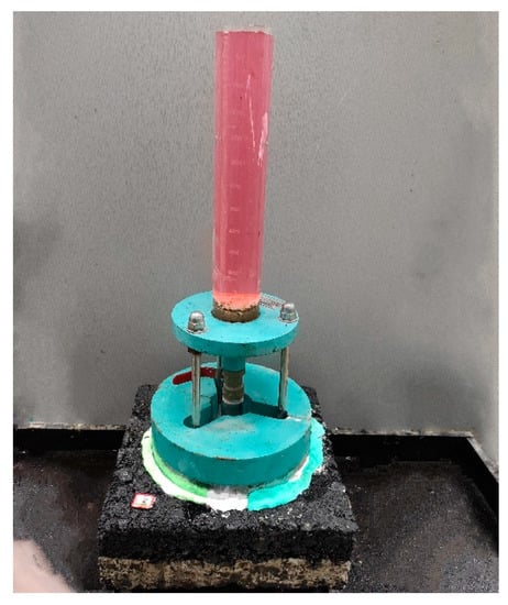 The double-layer plate sample was placed on a stable plane, and the seepage meter was placed on the surface of the sample, as shown in Figure 8. The base of the instrument was sealed. After placing the instrument, the test shall be carried out according to the operating procedure required by the specification [28]. Observe the water seepage of the specimen carefully. Under normal conditions, water will not leak out between the materials used for sealing on the base. The water penetration should come from the bottom and around the test piece. If it is not sealed well, the experiment needs to be retested.