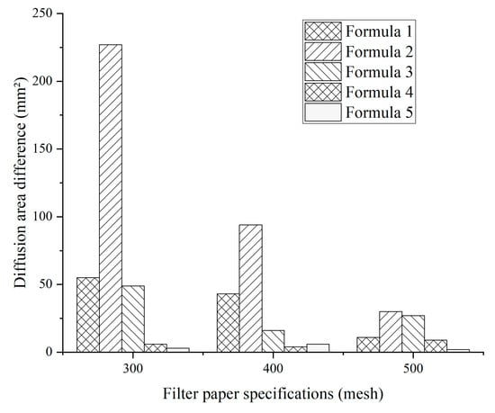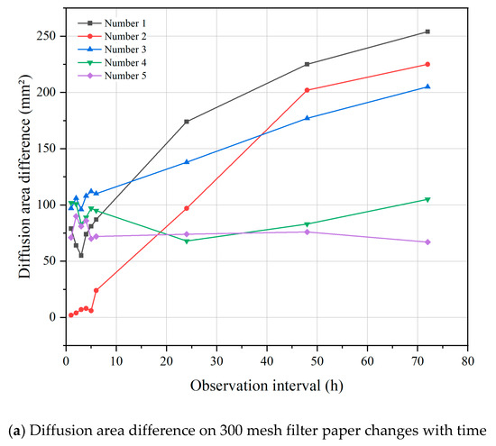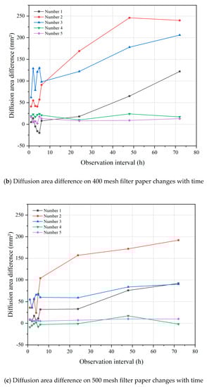 Five kinds of emulsified asphalt on filter paper of 300 mesh, 400 mesh, and 500 mesh; the photos had been taken at the interval of every 1, 3, 4, 5, 6, 24, 48 and 72 h. The diffusion area was calculated by pixel identification technology, and the diffusion area difference to the initial area (0 h) was analyzed. The test results are shown in Table 8 and Figure 9.