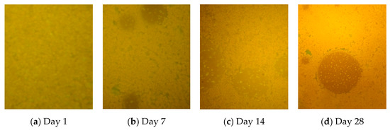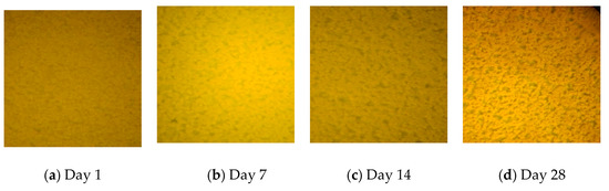 In this experiment, the microstructure of the newly developed high-permeability emulsified asphalt and the traditional emulsified asphalt in the laboratory were observed by fluorescence microscopy. The dispersion state of the asphalt particles and their changes with time under fluorescence microscopy of the two emulsified asphalts were observed and compared at intervals of 1, 7, 14, and 28 days. The results are shown in Figure 11 and Figure 12.