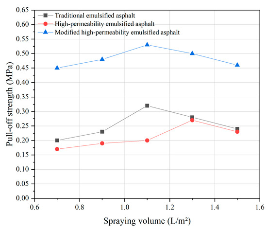 When ordinary (traditional) emulsified asphalt, high-permeability emulsified asphalt, and modified high-permeability emulsified asphalt were used as bonding materials, the pull-off strength results under different spraying rates are shown in Table 13.