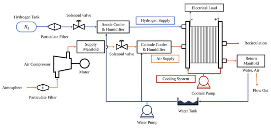 PEM fuel cells convert chemical energy into electrical energy through electrochemical reactions. Hydrogen is oxidized and split into hydrogen ions and electrons at the anode. Hydrogen ions travel across the electrolyte and electrons move through the electric circuit planted in the stack. On the cathode, they are combined with oxygen, and water is formed as a by-product. An electric potential is formed between the electrodes through the electrochemical reaction in the cell. Cells are stacked up to achieve a higher voltage and are used to construct a stack system. The PEM fuel cell system consists of a fuel cell stack and balance of plant (BoP). The BoP includes the air supply system, fuel supply system, and thermal management system. In this study, we address faults in the air supply system, fuel supply system, and fuel cell stack system. The Table 1 below shows sensors and actuators used in respective systems.