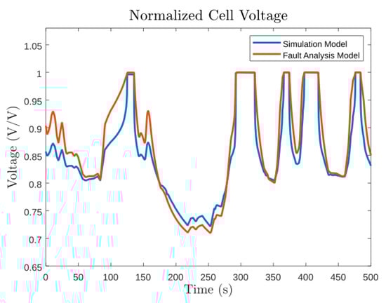 Comparison of normalized cell voltage between simulation model and fault analysis model.
