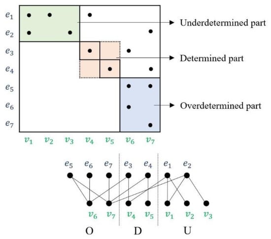 After clarifying the relationship between the variables of the model, the Dulmage–Mendelsohn decomposition is applied to the incidence matrix to determine the equation set with redundancy. With the Dulmage–Mendelsohn decomposition, equations are classified into three parts: the overdetermined part, the determined part, and the underdetermined part [22]. In the overdetermined case, the number of equations is greater than the number of unknown variables by more than one. To specify the unknown variables, the same number of unknown variables and unique equations are required. When there are more equations than unknown variables, the redundant equations can be used to determine the fault. The value of the fault variable will be zero in the case where there is no fault. The number of redundant equations is called the degree of redundancy. As the degree of redundancy increases, there are more methods to obtain the values of fault variables. In the determined case, the number of equations is the same as the number of unknown variables. Therefore, unknown variables can be specified, but there are no redundant equations and there is no possibility of determining the value of the fault variable. In the underdetermined case, the number of equations is less than the number of unknown variables that are related. There is no possibility of unknown variables nor of fault variables being determined.