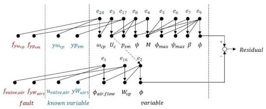 The incidence matrix shows the relationship between variables. With the incidence matrix, the overdetermined part of the result of the Dulmage–Mendelsohn decomposition is shown in Figure 4. Analytical redundancy exists in the overdetermined part, and single faults in this area are detectable. Faults not included in the overdetermined part were undetectable due to a lack of redundancy, and appropriate sensor placement is required to diagnose those faults.