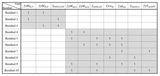 Fault analysis can be conducted with a mathematical model of PEM fuel cells. When a fault occurs, it propagates through variables that are related by mathematical equations. On the basis of this principle, the direction of the fault must be clarified by examining the relationship among equations. When the values of the known variables (e.g., control input, sensor measurement) are determined, the values of unknown variables can also be obtained with equations. Therefore, an incidence matrix, which is a logical matrix used to present the relationship between variables, is used. There are known variables and unknown variables, which are the variables that cannot be measured, and faults.