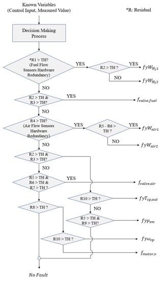 When the sensitivity of the residual is high, the fault tends to be detected more easily than when the sensitivity is low. For a better classification of the faults, a FDI algorithm is constructed with a top-down method based on the sensitivity of residuals. The flow of the FDI algorithm is presented in Figure 9. The threshold of each residual is chosen empirically rather than by following a general guideline since sensor noise tended to be amplified while being delivered over variables and showing residual overlap.