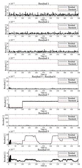 In the obtained residuals, a unique combination of faults is developed to obtain the fault signature matrix, as constructed in Figure 7. In the fault signature matrix, the combination of residual signals makes it possible to classify the fault, and a fault detection and isolation algorithm is developed.
