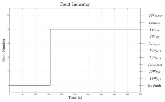 Prior to the fault analysis, components that are vulnerable to faults are chosen: faults in sensors, faults in actuators, and faults chosen from the study of the fault tree analysis (FTA) on PEM fuel cells [23,24]. Faults in sensors and actuators from Table 1 are both considered. From FTA, hydrogen leakage of PEMFCs and membrane degradation shows the highest mean failure rate among others. The failure rate was calculated from a Weibull distribution, which is used for lifespan data analysis. Furthermore, the stack voltage drop arises from PEMFC degradation. Fault equations are added into the system equation set, and fault analysis is conducted.
