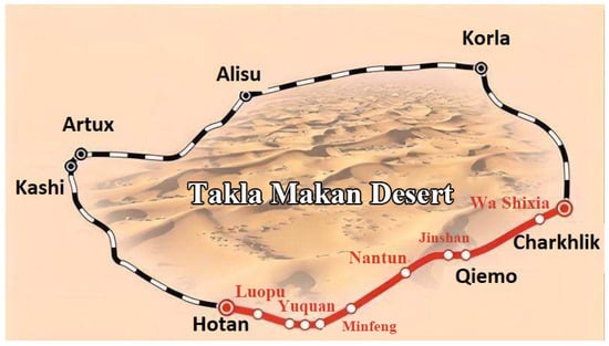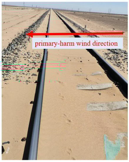 The improvement of transportation network brings good opportunities for the development of regional economy and society. China has built the world’s first railway around the Takla Makan Desert to promote economic development in Xinjiang (see Figure 1). However, the fact that wind-blown sand movement would jeopardize transportation facilities in deserts has been widely considered by people [1]. The accumulation of sand and dust particles on the desert tracks directly affects the safety of railway transportation, apart from decreasing the speed of railway transportation [2,3]. The sand intrusion can also have some negative influence on the dynamic mechanical behavior of railway ballast bed [4,5]. Therefore, it is of great practical importance to study a method for desert railways to prevent sand accumulation [6].