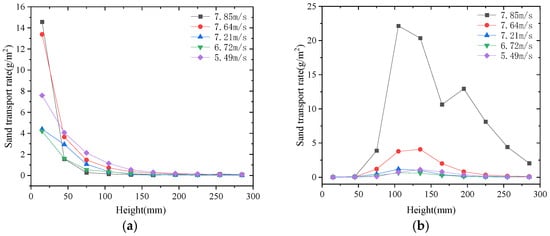 Figure 3 illustrates the change law of sand amount in the sediment collecting devices along the height direction under different wind speeds. From the figure, the sediment loads at No. 1, No. 5 and No. 6 sediment collecting devices decrease exponentially along the height direction, while those at No. 2, No. 3 and No. 4 sediment collecting devices are in unimodal distribution along the height direction, with one peak occurring within the height range of 120~150 mm. A similar distribution phenomenon was reported by Zhang et al. [36]. This mainly lies in the fact that the blocking effect of the track lifted the flow field to the rear of the track, making the sand transported with the wind jump higher and be transported further. In addition, the sand amount collected in the rear sediment collecting tubes increases continuously with increasing wind speed, indicating that wind speed is conducive to sediment transport. The unimodal distribution of sediment transport rate tends to disappear at the No. 4 sediment collecting tube, indicating that the lifting effect of the track on the flow field nearly disappears.