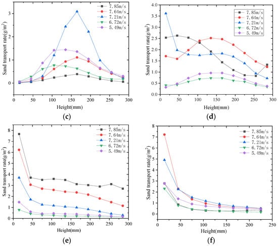 The sand transport rate of each sediment collecting device. (a) No. 1 sediment collecting device; (b) No. 2 sediment collecting device; (c) No. 3 sediment collecting device; (d) No. 4 sediment collecting device; (e) No. 5 sediment collecting device; (f) No. 6 sediment collecting device.