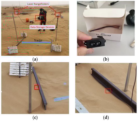 In order to investigate the distribution of sand deposition on the railway track under the same conditions, a railway model with two small tracks was developed. Considering the significant height difference between the track used in the experiment and the actual track, the rail gauge of the two tracks was proportionally scaled in the field experiment. The standard rail gauge is 1435 mm, but in this experiment, the rail gauge was set to 730 mm. For the sake of simplicity, the two rails were numbered and defined as the “first track” and the “second track” along the direction of incoming flow. Experience shows that in the case of wind-drift sand flow, sand may mainly deposit outside the first track and inside the second track along the direction of incoming flow. Therefore, after track setup two laser rangefinders were fixed on the supports (the supports were placed on one side of the experimental track so as not to affect sand deposition) to measure the sand deposition in front of first track and in front of second track along the direction of incoming flow. Relevant experimental facilities and the setting are shown in Figure 5. The laser rangefinders have a range resolution of 4 mm, measurement range of 0–10 m and precision higher than 4%. The experiment lasted about 20 min. The laser rangefinders measured the range data three times per second, which means the sampling frequency was 3 Hz. This experiment was carried out under natural wind conditions, with a wind speed of about 10 m/s.