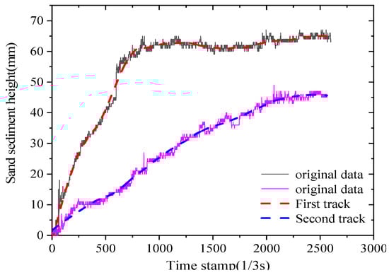 The experimental results are shown in Figure 6. In the figure, the black line represents the sand deposition velocity in front of first track. It can be seen that the sand deposits fast, and can reach a height of 60 mm in about 250 s, equivalent to 14 mm per min. After that, the deposition velocity tends to increase slowly. The red line represents the sand deposition velocity in front of second track. The figure shows that the sand deposits stably, and can reach a height of about 45 mm in 15 min, equivalent to 3 mm per min.