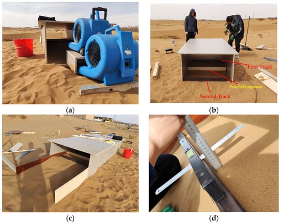 Based on the above experimental results, the conclusion can be drawn that placing an object in an appropriate position on a track could lift the wind field on the track for the second time, thereby significantly reducing the volume of sand deposition on the track. Therefore, a field experiment under natural winds was conducted to verify it. However, considering that the speed and direction of natural wind fluctuates frequently, and the track used is merely 1.1 m long, it is difficult to obtain a unified law of sand deposition on the track. Therefore, a simple wind tunnel was set up to prevent the diffusion of wind speed in the experimental section on the one hand, and to reduce the disturbance of natural wind on the experimental section so as not to affect the results, on the other hand. The wind tunnel has a 115 cm × 65 cm rectangular section. The wall of the wind tunnel is made of 1.8 cm thick composite boards, which are free from obvious warping. The fan is composed of two 220 V 50 Hz cleaning fans with a rated power of 1000 W. A frequency modulator can also be used to regulate the experimental wind speed. The air outlet of the fan at the bottom is placed slightly downward to ensure sufficient sand source. A fan located above the side provides a horizontal force for the blowing sand and making it move horizontally. The setup of experimental facilities and data acquisition methods are shown in Figure 7.