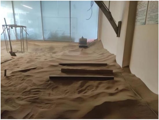 - Start the fan and the experiments on track sand deposition. The sand blowing time was set to 8 min after tests. The reason lies in the fact that a short sand blowing time may be associated with an unsatisfactory sand deposition effect, which is unfavorable for measuring the height of deposited sand. In contrast, if the sand blowing time is extremely long, the front track will be covered by too much sediment, while the sand will keep depositing on the rear track, which makes the height data of deposited sand invalid;