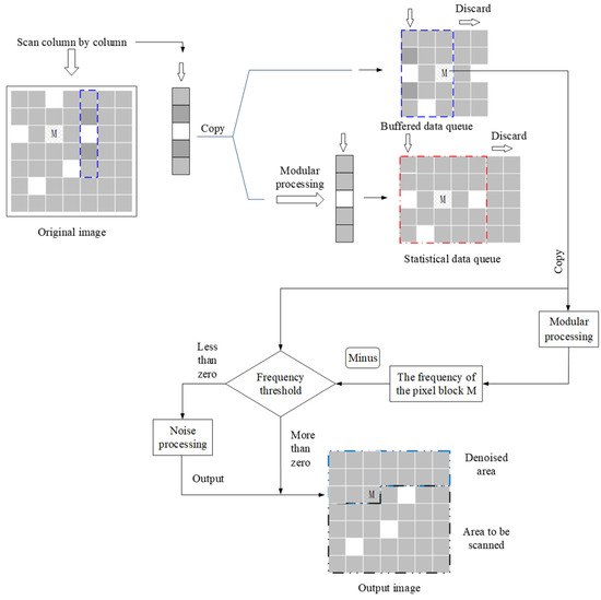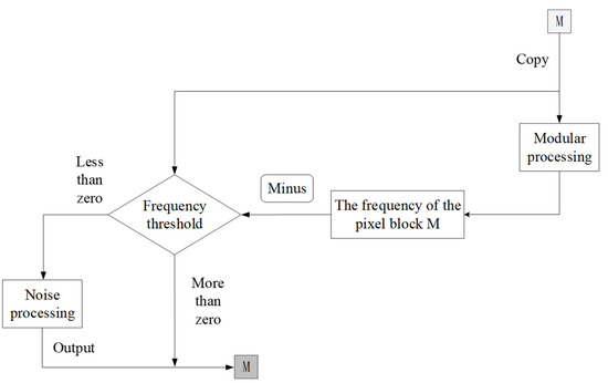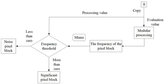 The basic principle of the image denoising method based on probability statistics proposed in this paper is shown in Figure 2. Based on the characteristic that the probability of noise is lower than the probability of an effective pixel block, the pixel block is screened by designing a frequency threshold. By identifying noise pixel blocks and valid pixel blocks, the information from valid pixel blocks can be retained. The mean value of the surrounding pixels is used to replace the noise points and achieve the effect of accurate noise filtering. The core technology of this method includes (1) reading and storing the original image, (2) modular processing of image data, (3) data frequency statistics, and (4) noise processing.
