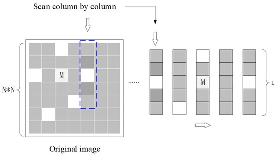 Suppose the original image is an N×N pixel image. Then take the L-dimensional column vector as the unit (N is greater than L) and scan the noise image to be processed from left to right and top to bottom according to the column. This obtains multiple raw pixel block columns and obtains pixel block values, as shown in Figure 3. The original pixel block column including L original pixels, contains both effective pixels and noise pixels. The pixel block value refers to the gray value of the pixel block.