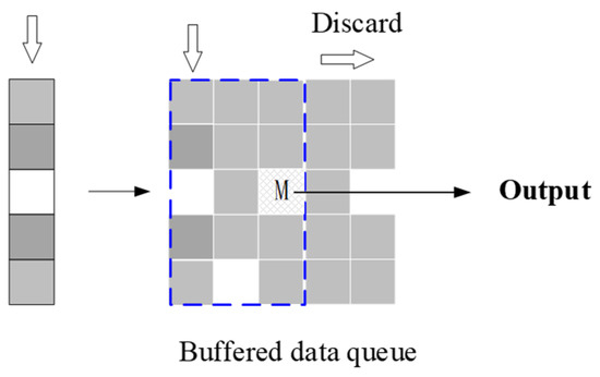 Data entering the buffered data queue do not need to be modularized and are fed directly to the end of the buffered data queue in column order. The buffer data queue is a data storage window with a fixed size of (that is, the quotient of L divided by 2 is rounded up and multiplied by L), as shown in Figure 6. This window is used to store data temporarily, and its output is the central pixel block value of the pop-up pixel block column, that is, the M value in the figure.
