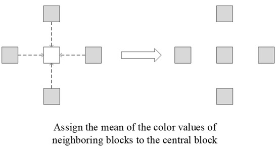 The purpose of modularization is to unify points with similar gray values in the image, reduce the impact of details and small changes on noise recognition, increase the recognition rate of effective pixel blocks, and thus improve the recognition of noise points. As shown in Figure 5, the gray values of pixel block 1 and pixel block 2 are the same after modularization. Therefore, by adjusting the minimum scale unit of modularization, we can reduce the loss of details and improve the ability to recognize noise points. When there are too many details in the image, the minimum scale unit can be adjusted higher. Most details can then be unified and will not be regarded as noise. When there are few details in the image, the minimum scale unit can be lowered. Highlighting the changes in the image can improve the ability to recognize noise.